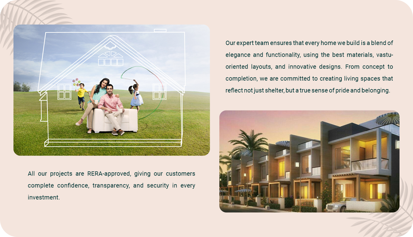Our vision is to offer the finest products and construction quality, ensuring that every project reflects trust, durability, and aesthetic excellence—whether it is a plot, a beautifully designed home, or a luxury township.